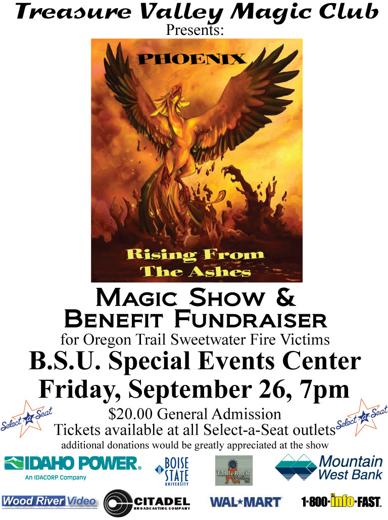 The Treasure Valley Magic Club is putting on a benefit fund raiser magic show entitled "PHOENIX - Rising From The Ashes". All proceeds will go to the burned out victims. With gracious donations for a stage and the many other things needed to put on a magic show, we hope to raise $10,000.00 for the victims. So far the support has been great and we are looking forward to an even greater show on September 26.